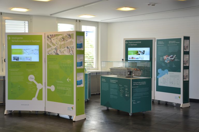 Die Kompetenzstelle Effiziente Mobilität stellt Arbeitsfelder, Projekte und Kompetenzträger des sächsischen Netzwerkes vor. Die 2017 neu konzipierte Ausstellung präsentiert auf Schautafeln, Podesten, mit Exponaten und Filmen neben Basiswissen auch Informationen zu Elektromobilität und Intelligenten Verkehrssystemen (IVS).