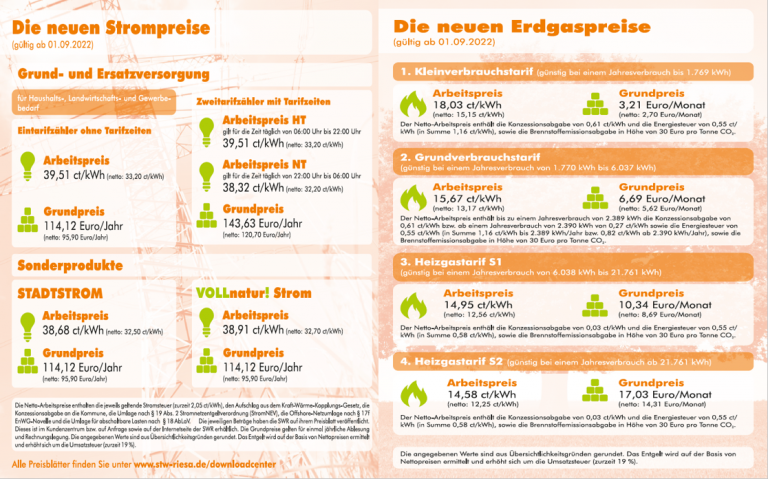 Die Arbeitspreise für Erdgas steigen zum 01.09.2022 um 4,40 Ct/kWh (brutto) an. Unsere Stromkunden zahlen ab dem 01.09.2022 für eine Kilowattstunde 12,05 Ct/kWh (brutto) mehr.
