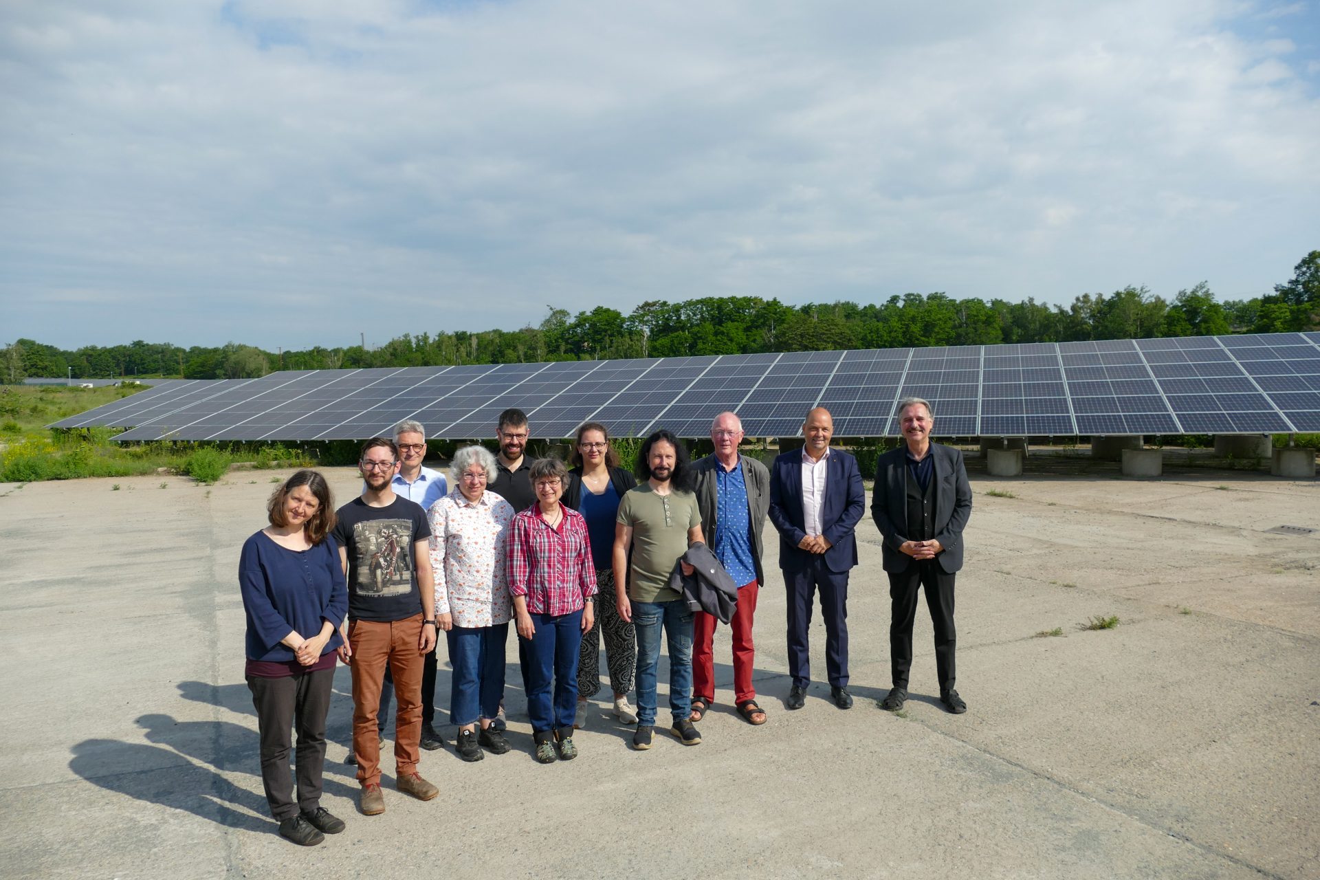 Pfarrer und Pfarrerinnen der evangelischen Kirchgemeinde der Regionen Riesa, Großenhain, Radeburg treffen sich auf Einladung der Stadtwerke Riesa (SWR) im Rahmen ihres Wanderkonventes am PV-Kraftwerk Rostocker Straße in Riesa.