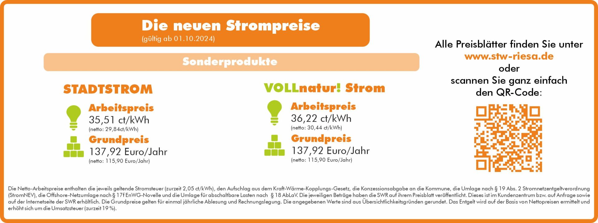 Die Stadtwerke Riesa GmbH schreiben alle STADTSTROM, VOLLnatur!Strom sowie VOLLProfi!Strom an und informieren über die neuen Preise. Alle anderen Kunden oder auch Neukunden können sich über die neuen Energieprodukte auf der Homepage www.stw-riesa.de informieren oder Sie lassen sich von unseren Mitarbeitern im Kundenzentrum beraten.