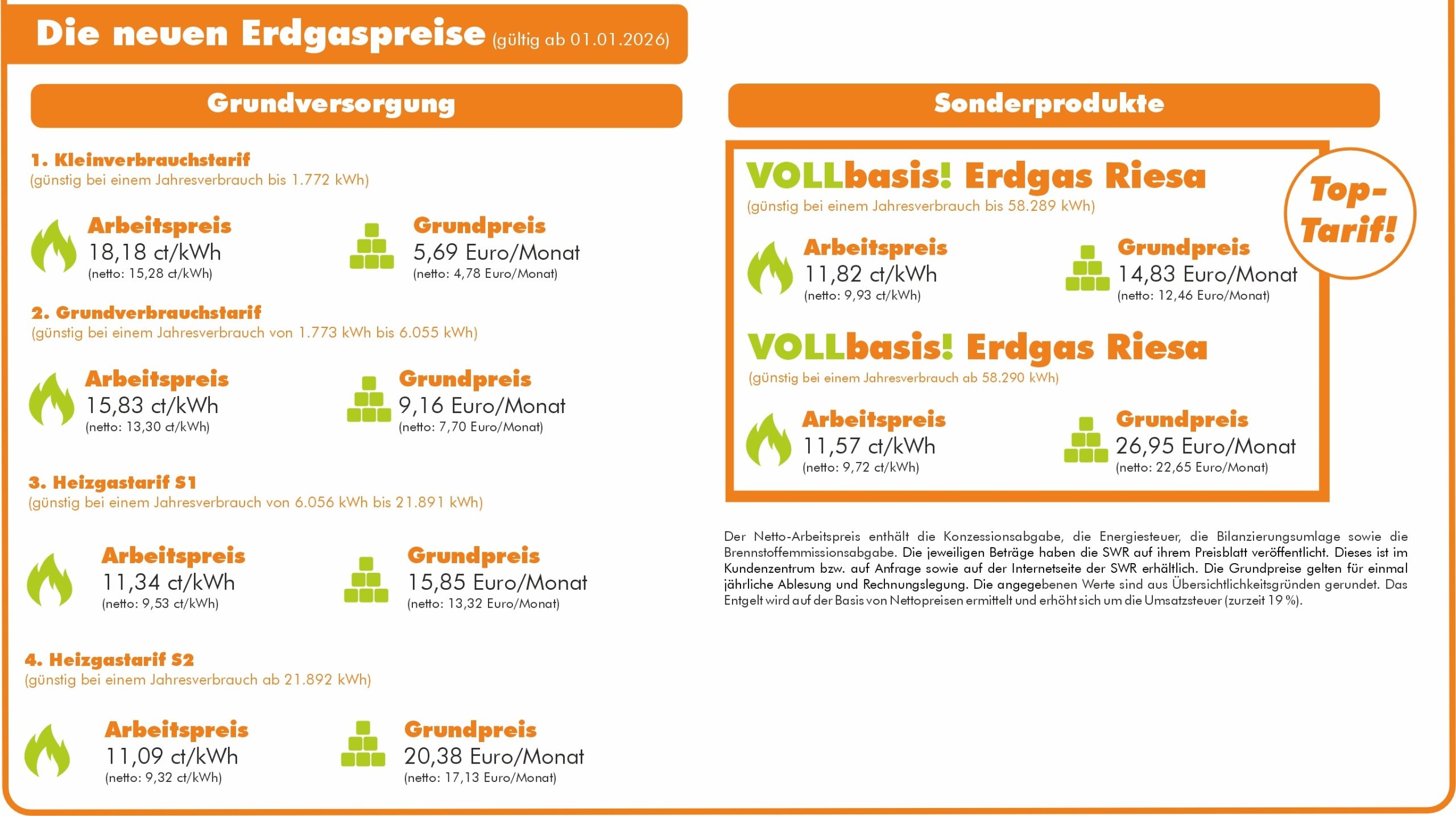 Für das Jahr 2026 konnte die SWR ihre Erdgasbeschaffungspreise senken. Die Beschaffungskostensenkung von rund 2,38 Ct/kWh (brutto) geben wir an unsere Erdgaskunden weiter.